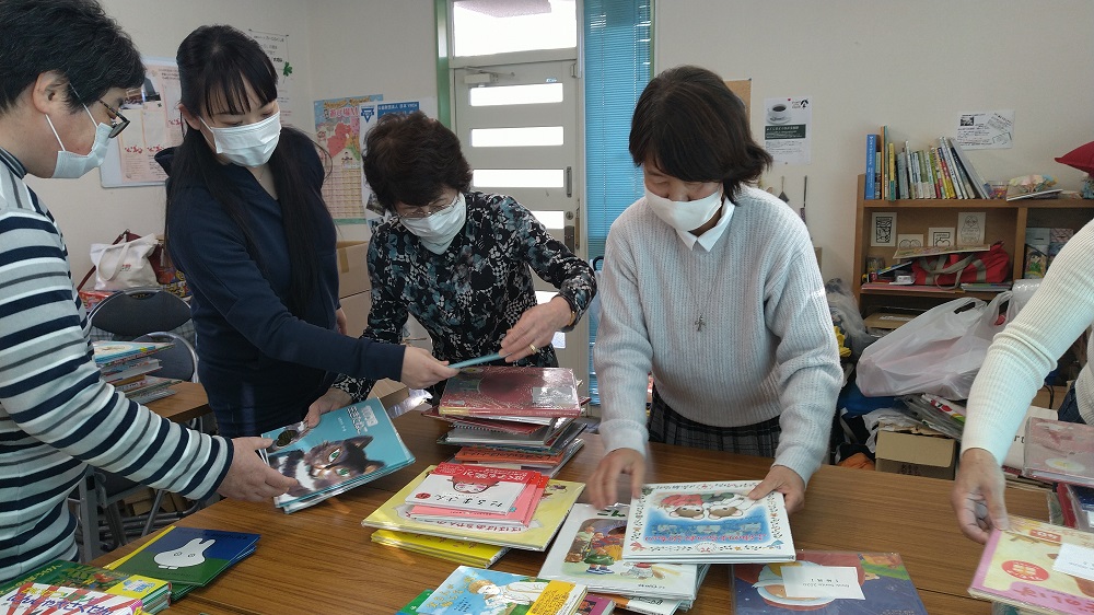 作業後はお茶を頂きながら近況報告。久しぶりに集った皆さんの元気な笑顔と、絵本を受け取った子どもたちの笑顔が重なり合うような、和やかなひとときでした。